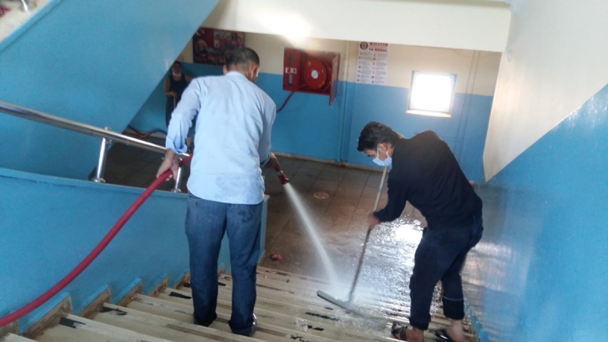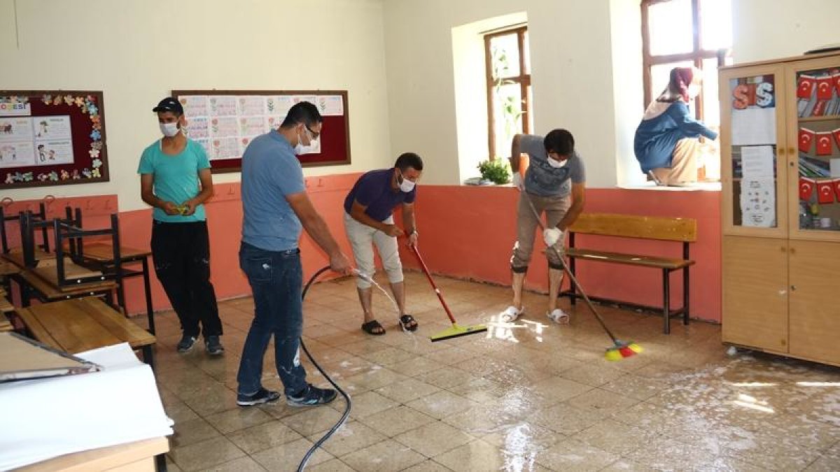 Muş’un Bulanık ilçesinde öğretmenler, yüz yüze eğitim öncesi okullarını sabunlu suyla temizleyerek, eğitime hazır hale getirdi. Turgut Özal İlk ve Ortaokulu’nda görevli öğretmenler, 636 öğrencinin eğitim göreceği okulu kendi imkanlarıyla aldıkları malzemelerle temizledi. Okulun bahçe, tuvalet, kapı, pencere, sıra, masa, koridorlar ile sınıfları salgına karşı sabunlu suyla yıkayıp dezenfekte eden öğretmenler, sınıfları da Kovid-19 tedbirleri kapsamında sosyal mesafeye uygun dizayn ederek öğrenciler için uygun ortam oluşturdu.