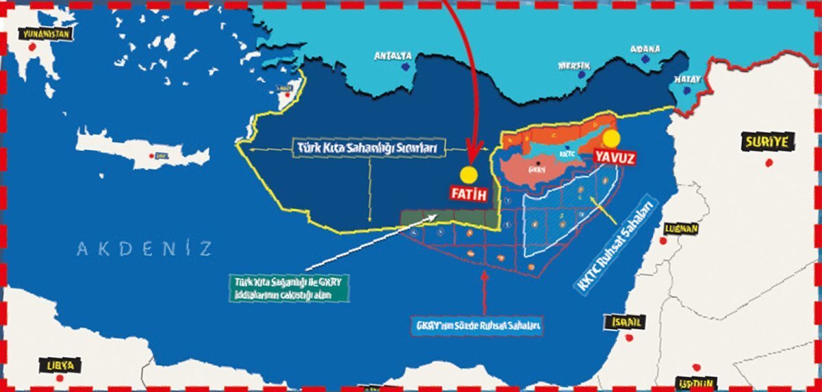 KKTC tarafından Türkiye Petrolleri’ne (TP) devredilen sahalarda süren sondajlarda sonuç alınıyor. Bir süredir Kıbrıs batısındaki Baf açıklarında doğalgaz-petrol arayan sondaj gemisi Fatih’in, piyasa değeri 40 milyar dolara ulaşan 170 milyar metreküplük doğalgaz bulduğu iddia edildi. Türkiye’nin ikinci sondaj gemisi Yavuz ise Kıbrıs doğusundaki aramalarını Karpaz açıklarında sürdürüyor. Rusya’dan alınan S-400 bataryasının Doğu Akdeniz hava sahasını kapatacağından endişelenen Yunan basını ise “Fatih’in son gaz keşfinin Rum Kesimi’nde alarma neden olduğu” yönünde haberler yayınlıyor. Derin denizdeki gelişmelerin Yunan basını tarafından Avrupa Birliği dişişleri bakanları toplantısından önce duyurulması, Avrupa’nın panik halinde bir dizi yaptırım kararı almasına yol açtı.