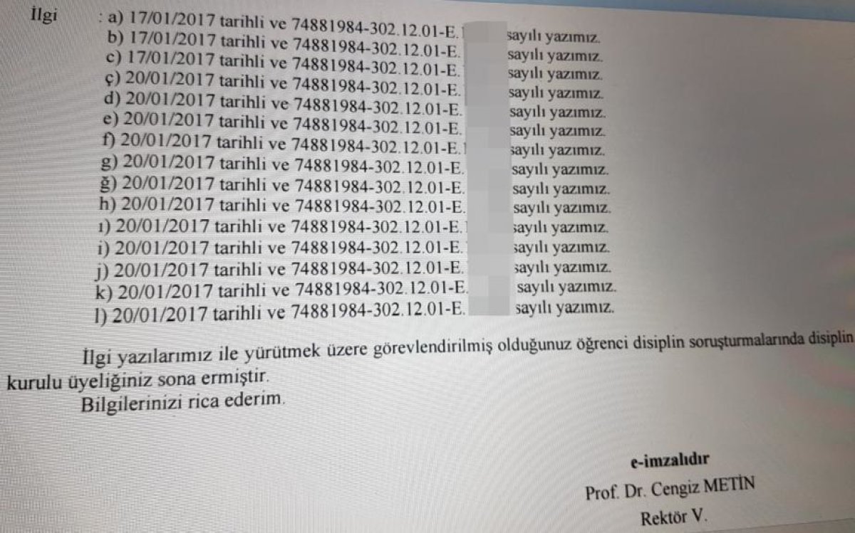 Aydınlık’ın ulaştığı belge 30 Mart 2017 tarihli. Ege Üniversitesi Rektör Vekili Prof. Dr. Cengiz Metin’in elektronik imzasını taşıyan belge, Elektronik Bilgi Yö- netim Sistemi’ne (EBYS) yüklendi. Belgede, Çakıroğlu cinayetiyle ilgili olayları soruşturan komisyondaki bir öğretim üyesinin, Ege Üniversitesi bünyesinde kurulmuş 15 ayrı komisyon üyeliği görevinden alındığı bildiriliyor. “Komisyonu değiştirmedik” diyen Rektörlüğün gerçek dışı beyanını ortaya çıkaran ve Rektör Vekili Metin’in gönderdiği resmi yazıda, “İlgi yazılarımız ile yürütmek üzere görevlendirilmiş olduğunuz öğrenci disiplin soruşturmalarında disiplin kurulu üyeliğiniz sona ermiştir. Bilgilerinizi rica ederim” ifadeleri yer alıyor. Belgede komisyonların 17 ve 20 Ocak’ta görevlendirildiği görü- lüyor. Bu tarihler YÖK denetçilerinin üniversiteye gelerek komisyon kurulmasını istediği tarihe denk düşüyor.