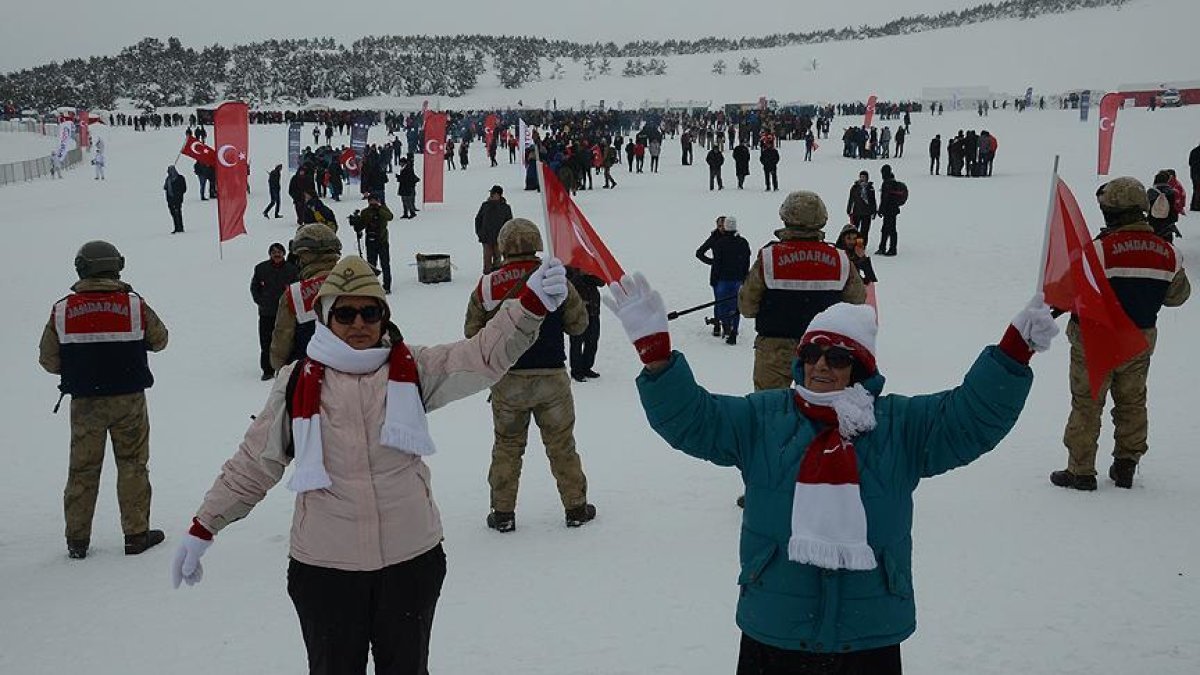 Kars merkez ve Sarıkamış ilçesinde otobüslerle zirveye bırakılan vatandaşlar, ellerinde Türk bayraklarıyla yaklaşık 2 kilometre yürüyerek toplanma alanına geldi.