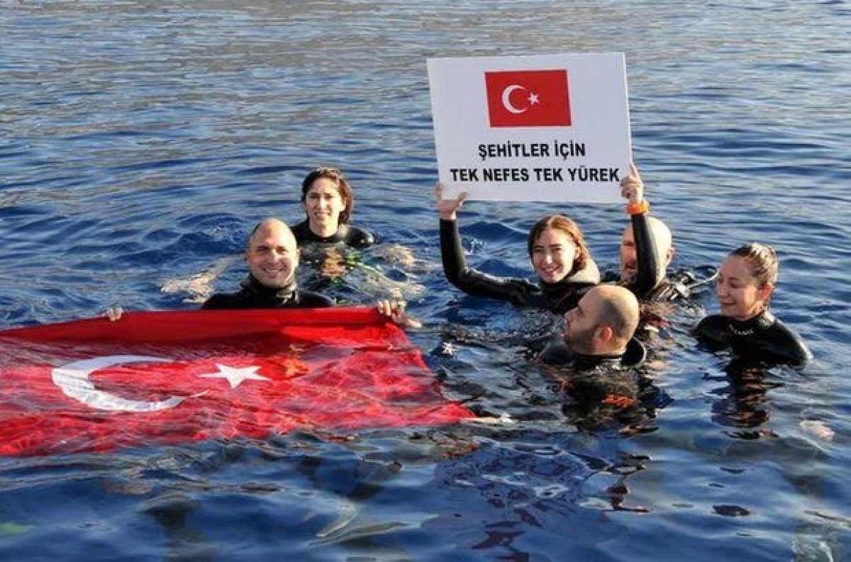 Sporcu, zaferini kutladığı ekip arkadaşlarıyla denizde Türk bayrağı ve üzerinde “Şehitlerimiz için tek nefes, tek yürek” yazan bir pankart açtı.