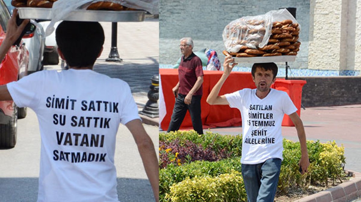 Kocaeli’de simitçilik yaparak geçimini sağlayan Erkan Ayhan, bir günlük gelirinin tamamını 15 Temmuz darbe girişiminde şehit olan vatandaşların ailelerine bağışladı. Kocaeli’nin Derince ilçesinde simitçilik yaparak geçimini sağlayan Erkan Ayhan isimli vatandaş örnek bir davranışa imza attı. Bir günlük kazancının tamamını 15 Temmuz darbe girişiminde şehit olan vatandaşların ailelerine bağışlayan Erkan Ayhan, satış yaparken de üzerine giydiği tişört ile kampanyasını duyurdu. Özel yaptırdığı tişörtünün ön yüzüne “Satılan simitler 15 Temmuz Şehit Ailelerine” yazdıran Kandıralı simitçi Ayhan, arka tarafına ise, “Simit sattık, su sattık ama vatanı satmadık” sözünü yazdırdı.