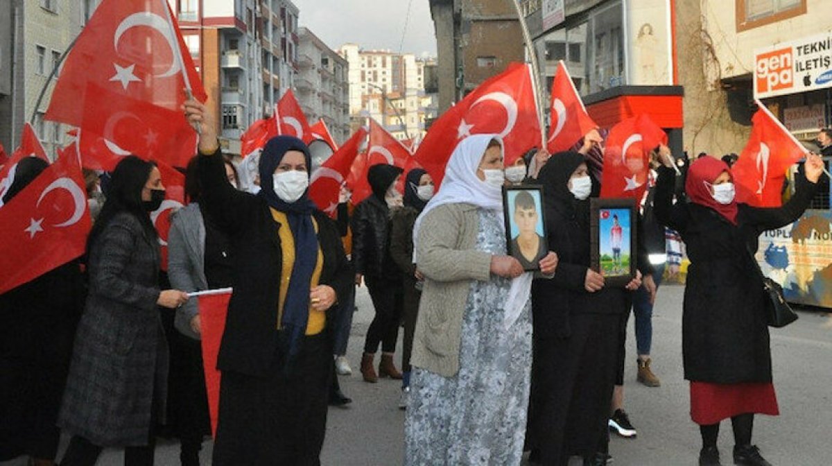 Ellerinde, Türk bayrakları ile dağa kaçırılan çocuklarının fotoğraflarını taşıyan aileler, “kahrolsun PKK, işbirlikçi HDP”, “şehitler ölmez, vatan bölünmez”, Kürt Türk kardeştir ayrım yapan kalleştir”, “kahrolsun PKK, tırnakçı HDP” şeklinde slogan attı.