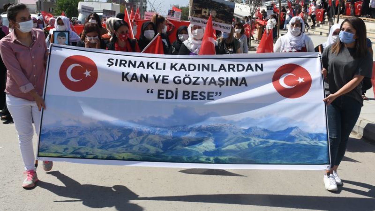 Şırnak’ta şehit ve gazi eşleri ile çocukları dağa götürülen anneler, terör örgütü PKK’ya karşı “Edi Bese” (Artık Yeter) yürüyüşü yaptı. Ellerinde Türk bayraklarıyla Yeni Mahalle Geylani Camisi önünde toplanan Şırnaklı kadınlar, Cizre Caddesi’nden “Şehitler ölmez vatan bölünmez”, “Kahrolsun PKK” sloganları atarak HDP İl Başkanlığı binası önüne kadar yürüdü.