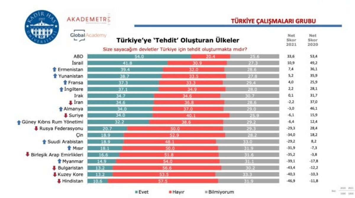“Türkiye için tehdit oluşturan ülkeler hangileridir?” sorusuna verilen yanıtlar da bu yılki araştırmada değişmedi. ABD, yüzde 54’lük oranla, “Türkiye için tehdit oluşturan ülkeler sıralaması”nda ilk yerini korudu. İsrail de yüzde 41.8 ile yine ikinci sıraya yerleşti. Bu listeyi Ermenistan, Yunanistan, Fransa ve İngiltere takip etti.