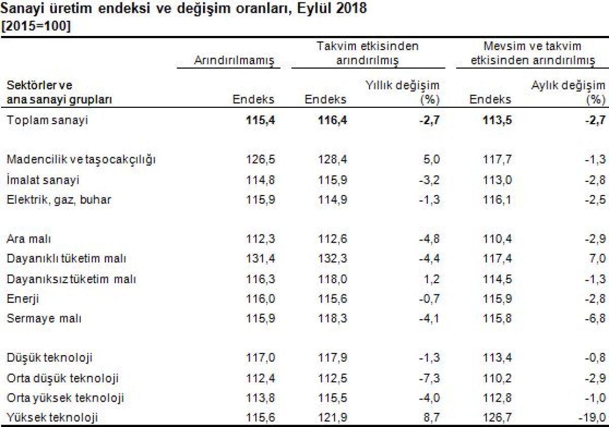 Sanayinin alt sektörleri (2015=100 referans yıllı) incelendiğinde, 2018 yılı Eylül ayında madencilik ve taşocakçılığı sektörü endeksi bir önceki aya göre %1,3, imalat sanayi sektörü endeksi %2,8 ve elektrik, gaz, buhar ve iklimlendirme üretimi ve dağıtımı sektörü endeksi %2,5 azaldı.