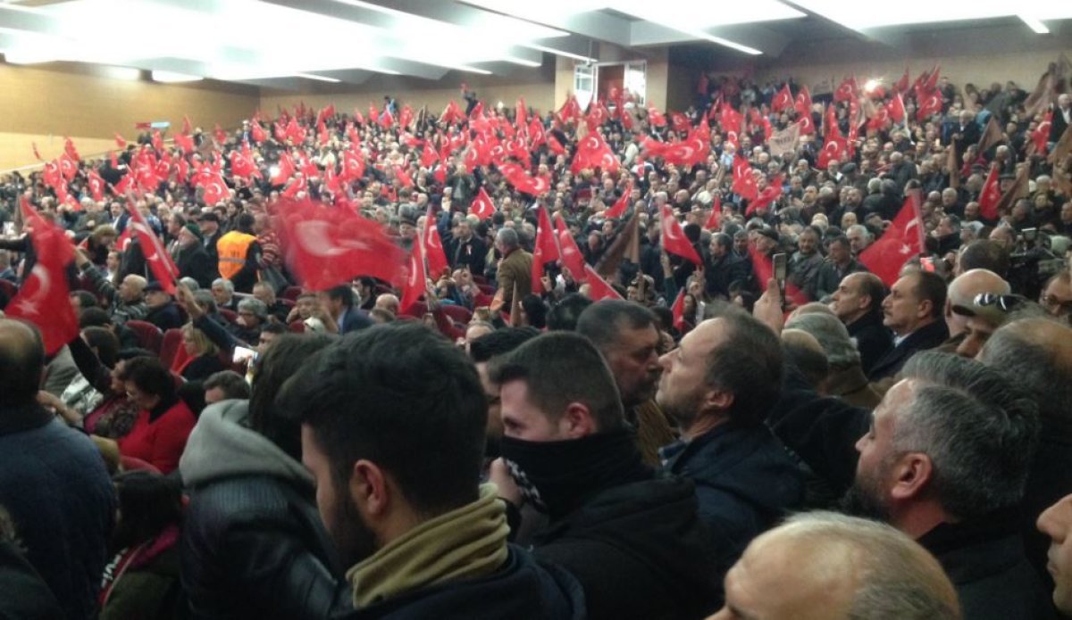 Türkiye genelinden ülkücüler, sabah erken saatlerden itibaren 1600 kişilik kültür merkezini doldurmaya başladı. Salon Mustafa Kemal Atatürk ile Alparslan Türkeş’in afişleri ile donatıldı. Bir afişte ise ‘Ülkem için, Ülküm İçin Hayır” yazısı yer aldı.